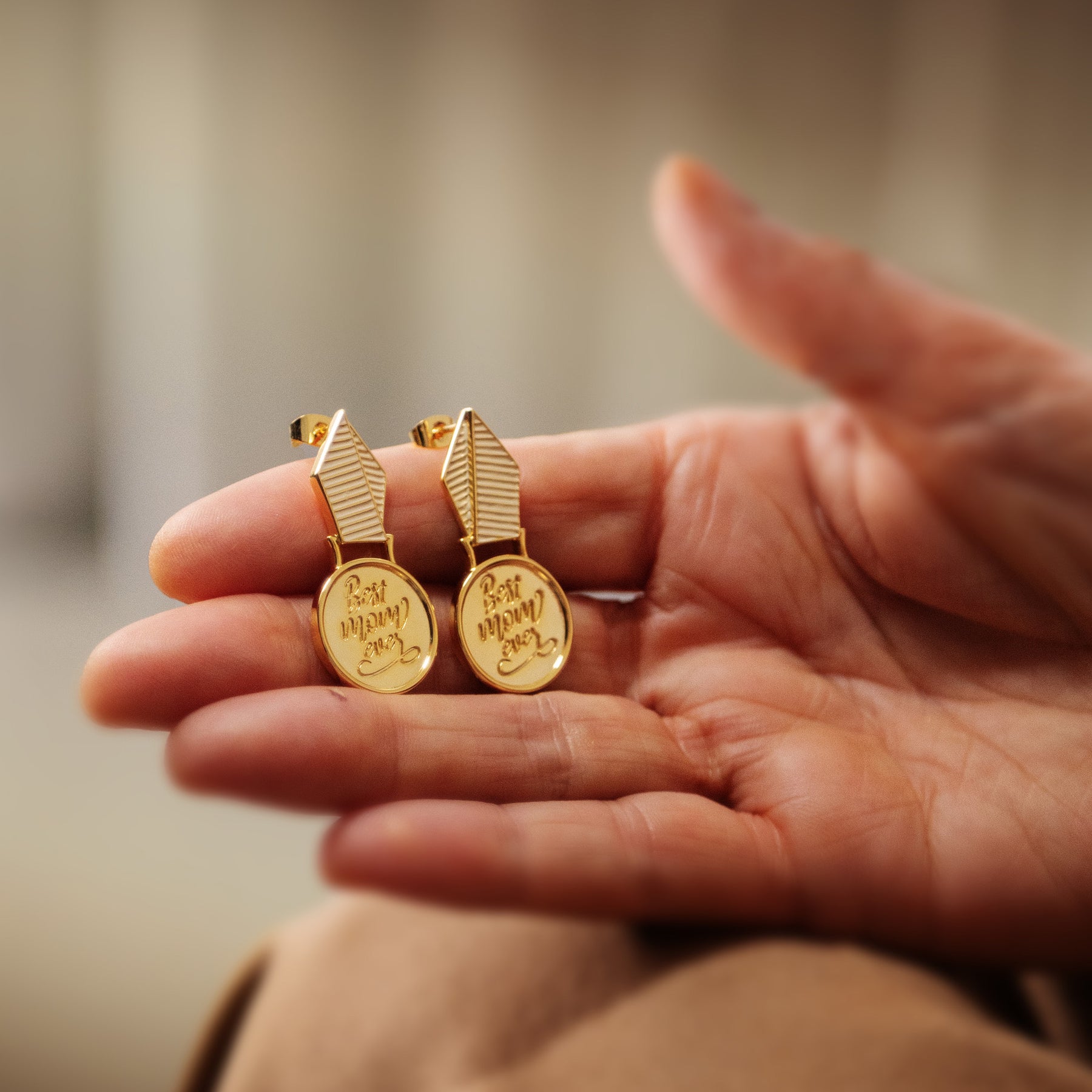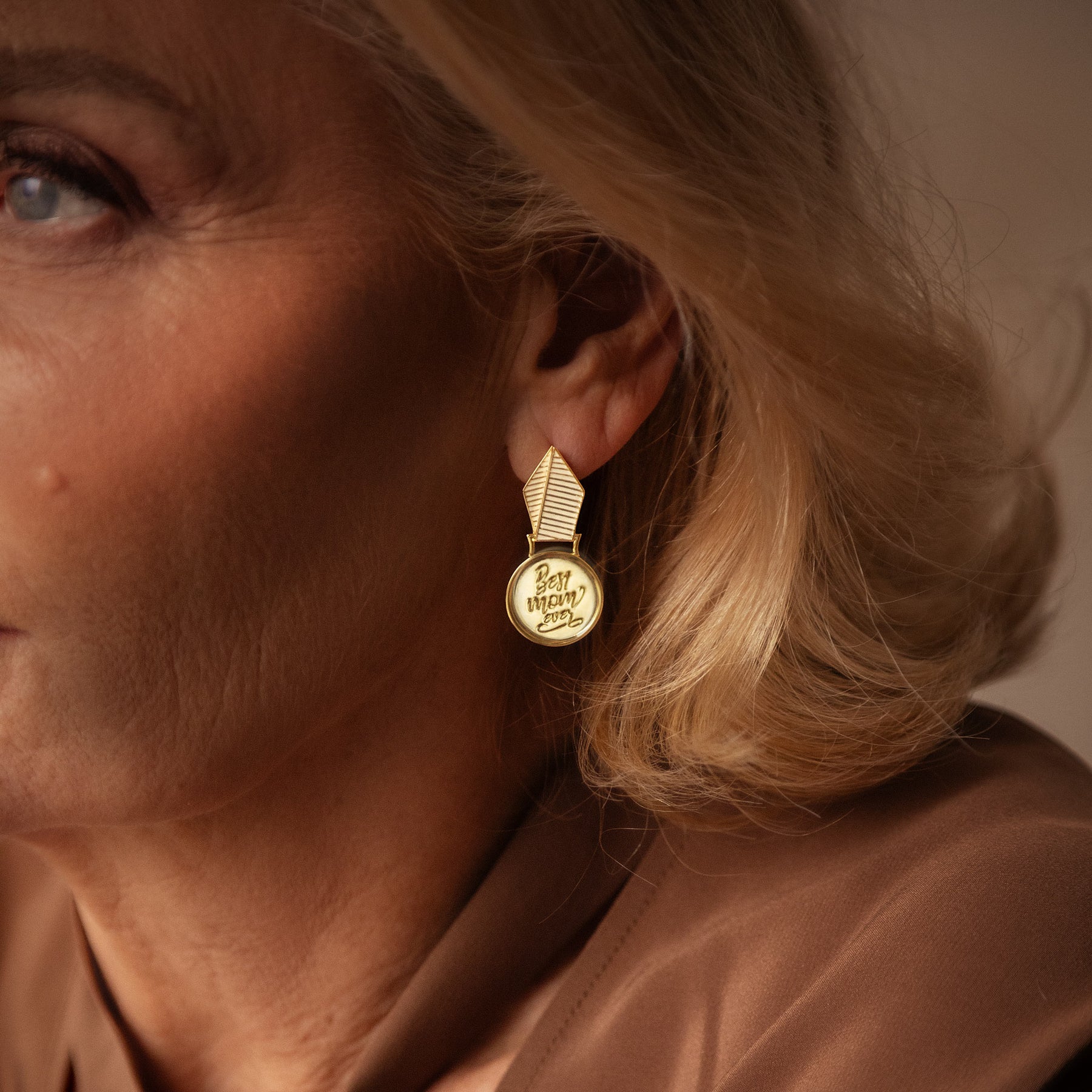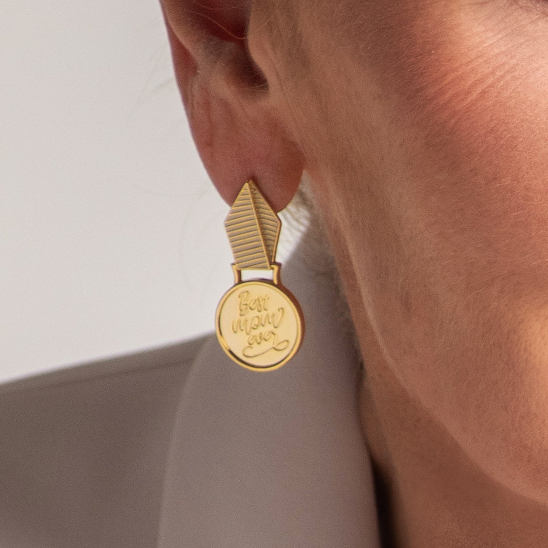 Gold-plated earring with a Best Mom Ever text worn by a woman against a neutral background