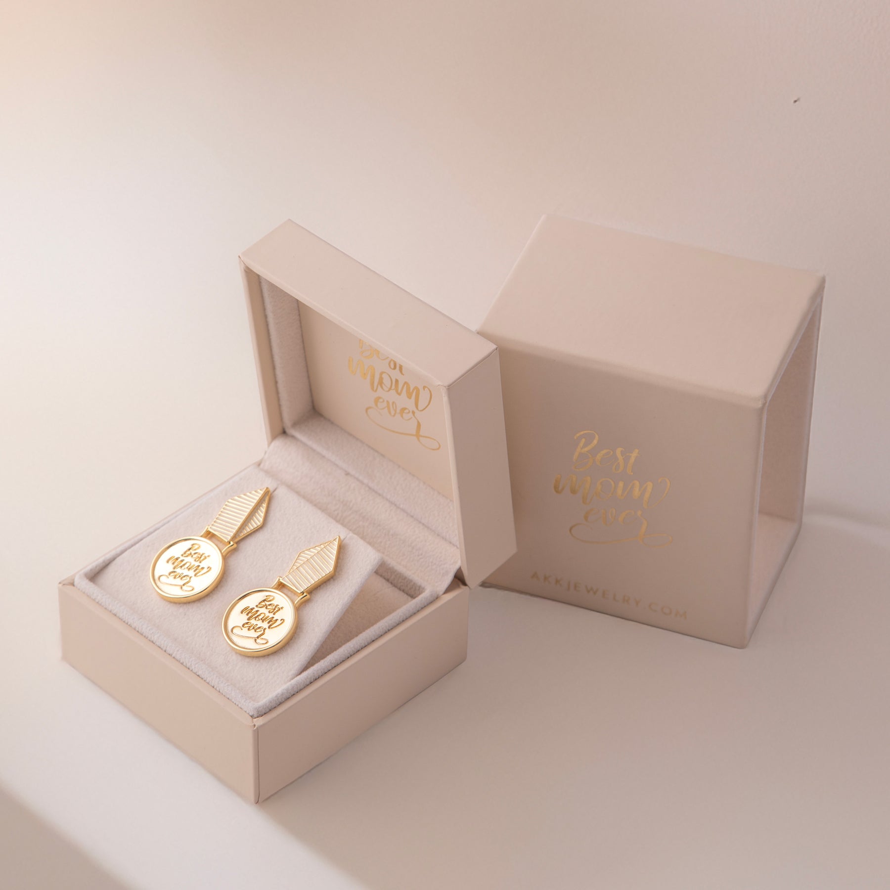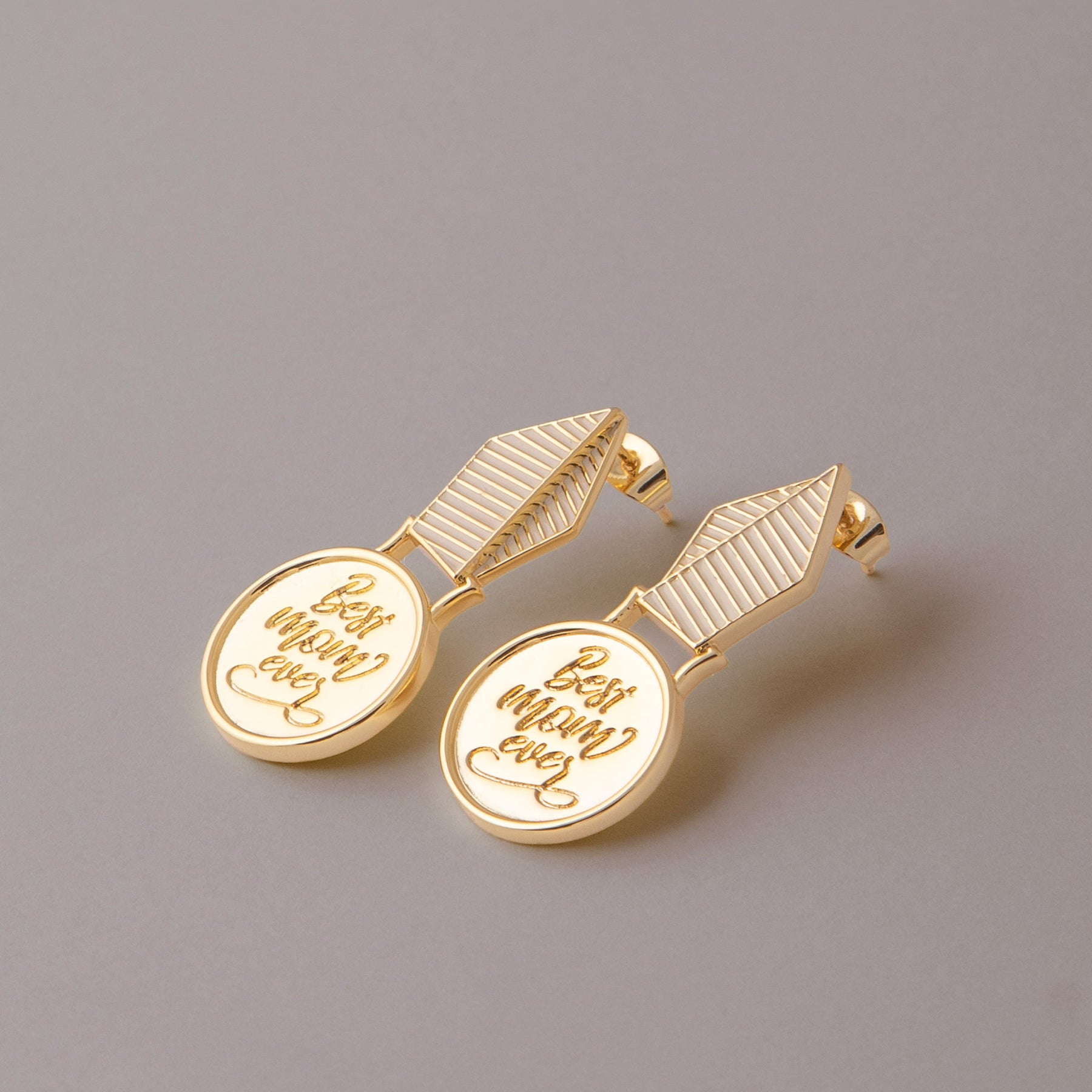 Pair of earrings with a Best Mom Ever text on a plain background