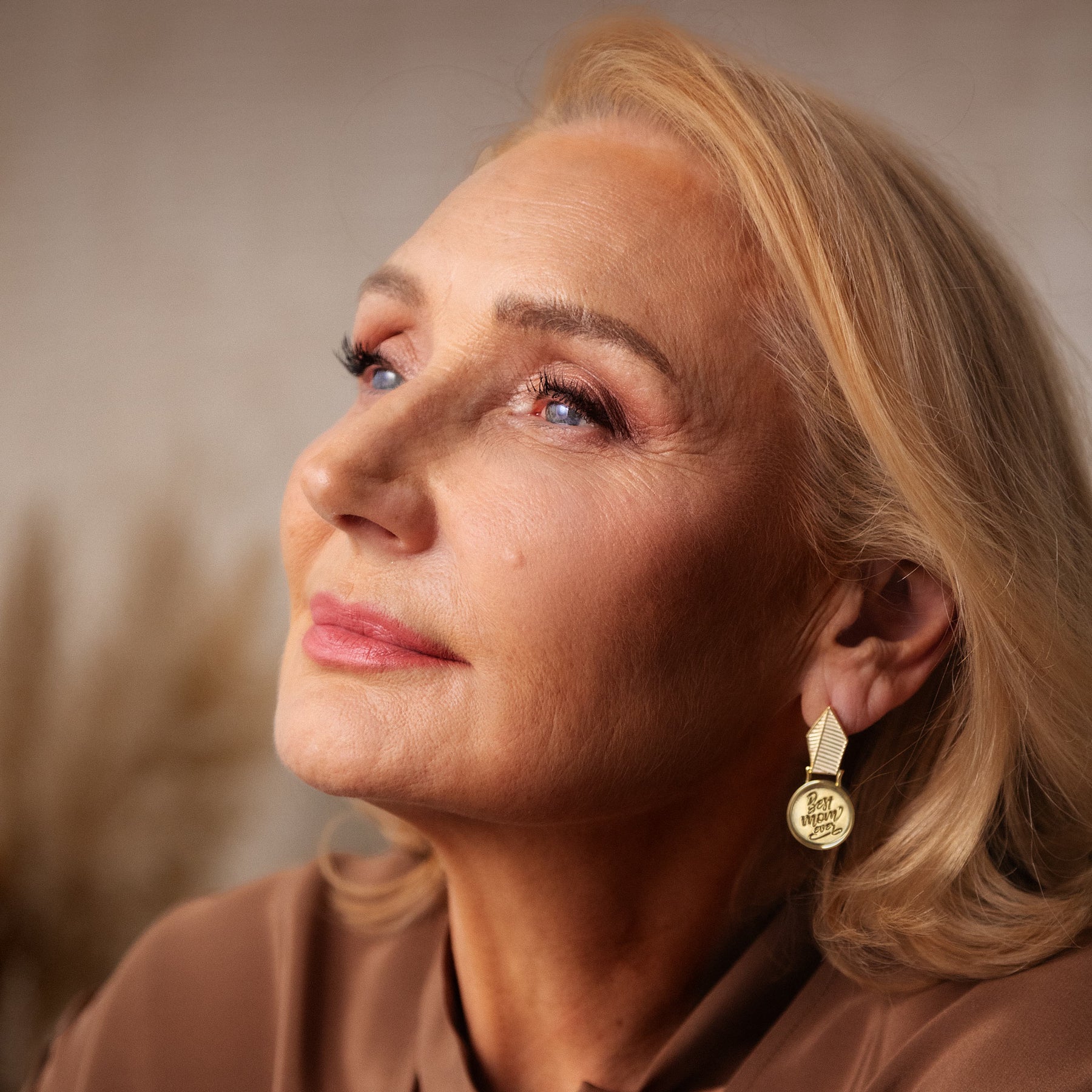 Close-up of a woman with blonde hair and earrings, wearing a brown top