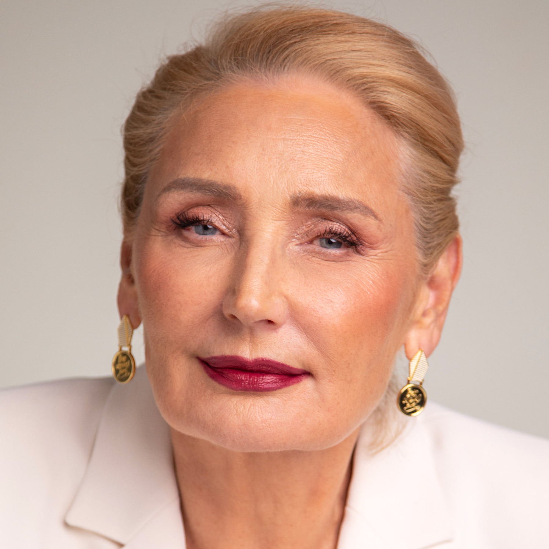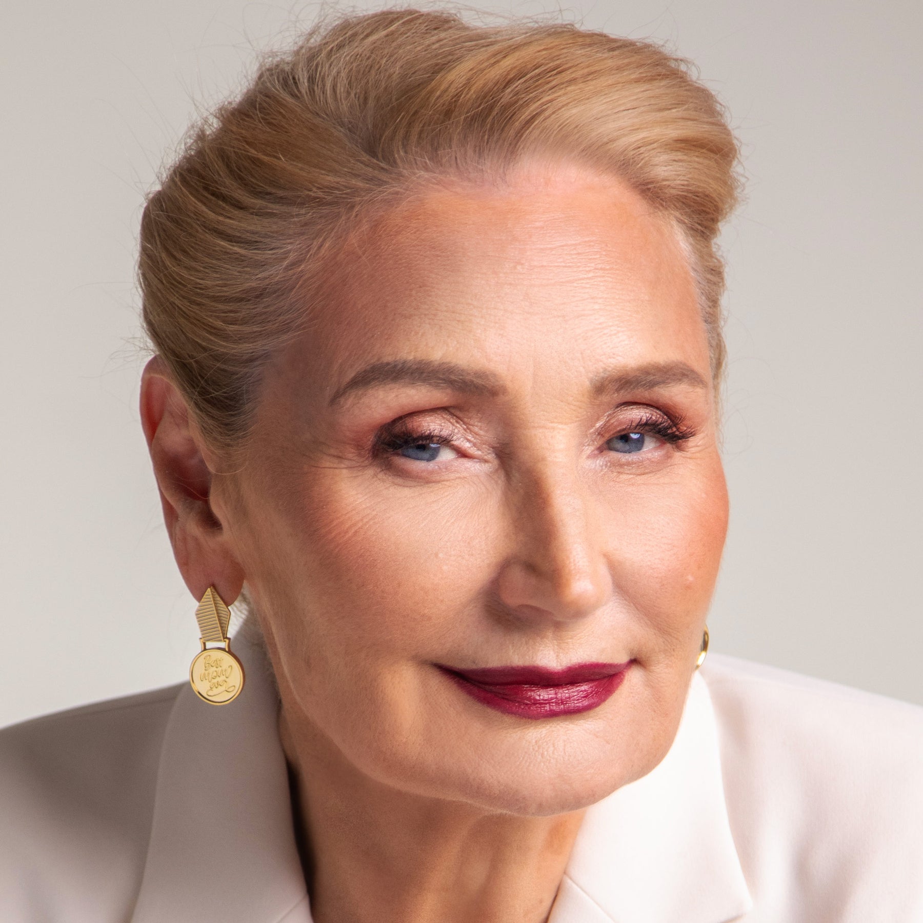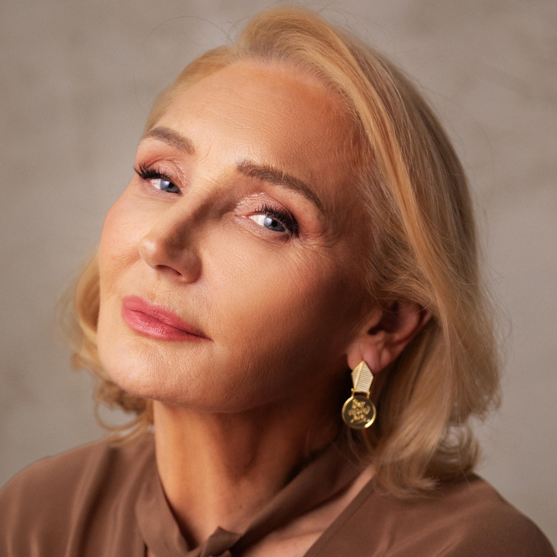 Woman with blonde hair and a gold earring against a neutral background